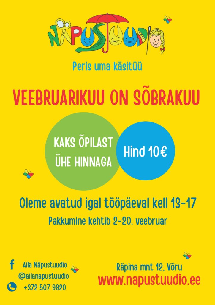 Veebruarikuu on sõbrakuu Sind võib veel huvitada:Näpustuudio tegevuskalender 2025/2026Lastefestival 2025Otsime uut juhendajat!Meisterdamissuvi 2025 aeg: 02.02.2026-20.02.2026koht: Näpustuudio